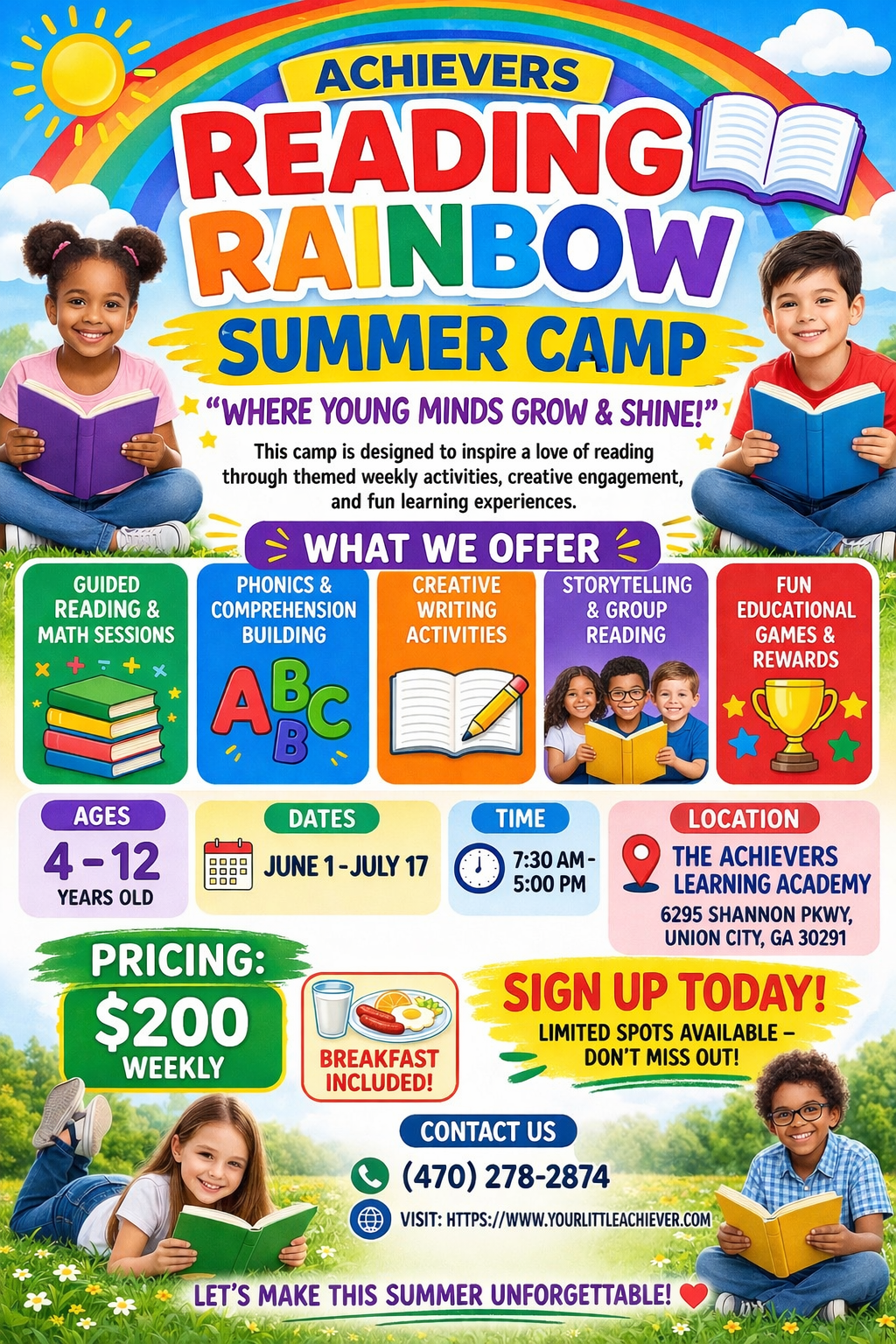 Sign up for our wonderful summer camp program! Your Achievers is sure to have a fun filled summer with academics, games, field trips, swimming, art, and so much more!